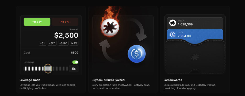 - Rewards System: Earn $SPACE tokens and USDC through trading, providing liquidity (LP), referrals, tasks, and community engagement. Season 1 is already live, dishing out points to early participants.
